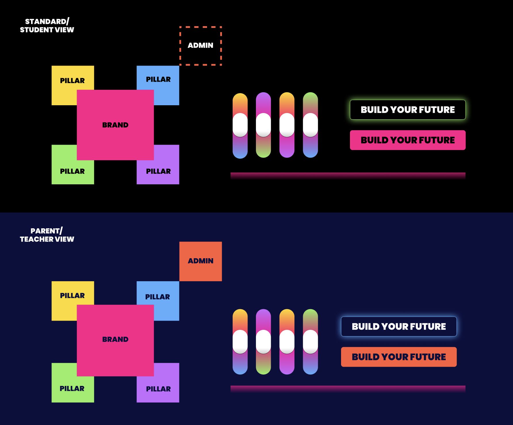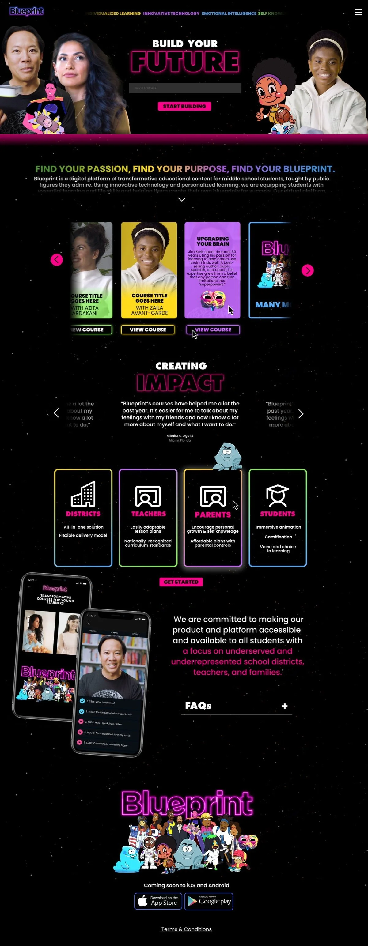 I evolved the Blueprint brand system to create a digital presence that’s futuristic & engaging for middle school students, complete with color palette & digital style guide.