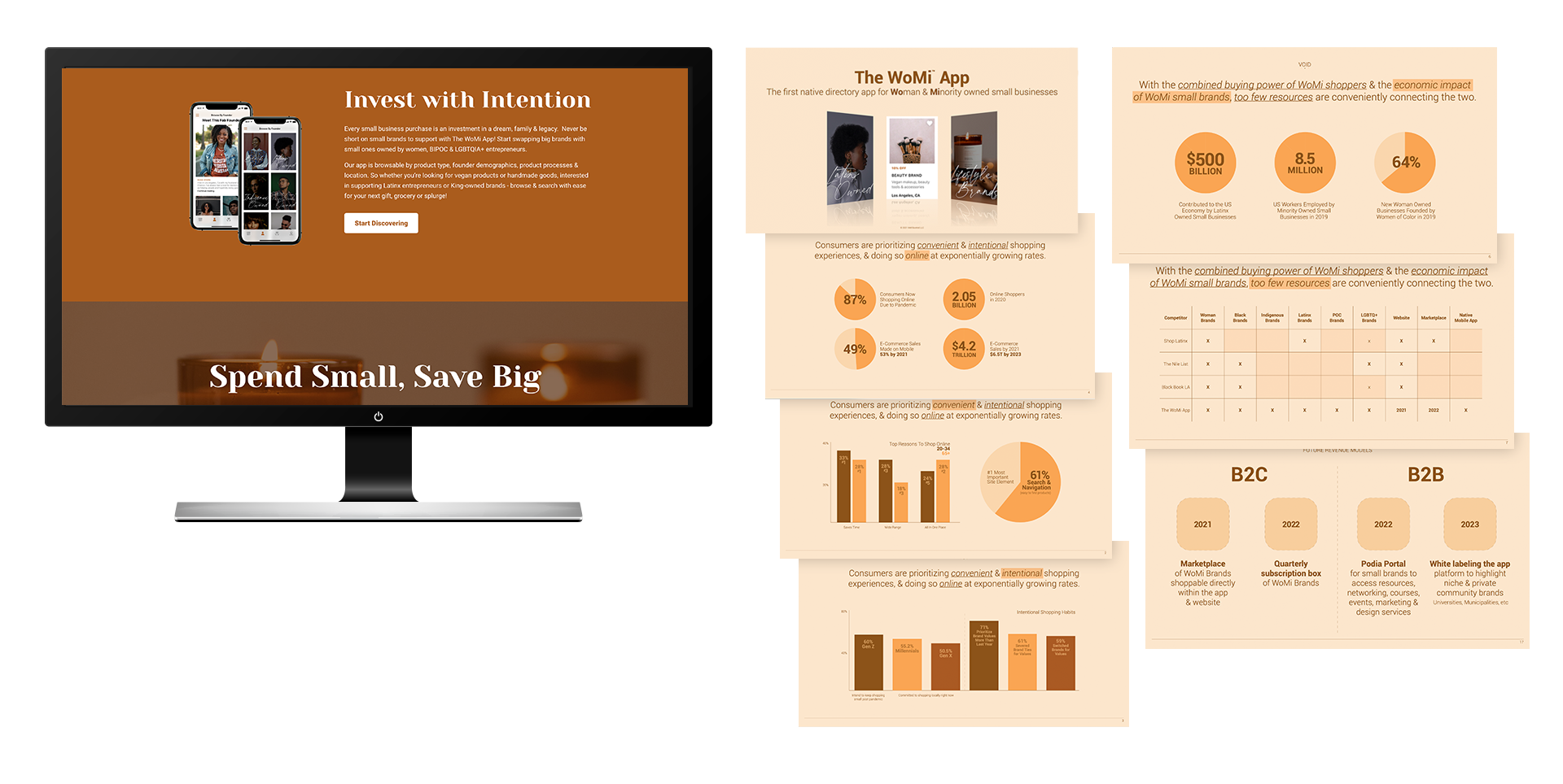 In order to recruit brand signups & funding, I designed modular & scalable systems for pitch decks & shopwithwomi.org.